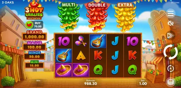 The demo below lets you try 3 Hot Chillies with play money. Use it to check the 5x3 layout, the 25 paylines, symbol behavior, and how Hold and Win and the Buy option work. The demo is not a cash session, so it won't match real balance changes, deposits, withdrawals, or casino promo rules.